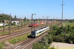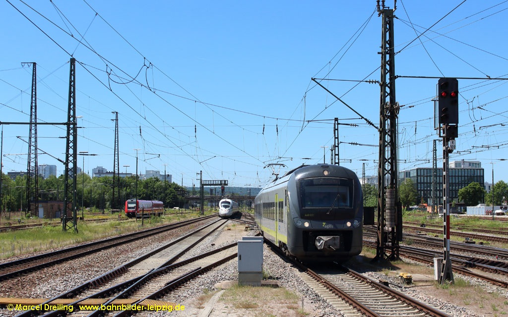 am 14.06.2021 als RB15 84255 aus Ulm Hbf in Regensburg Hbf, links 411 030 als ICE 91 Dortmund Hbf - Wien Hbf
