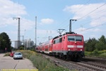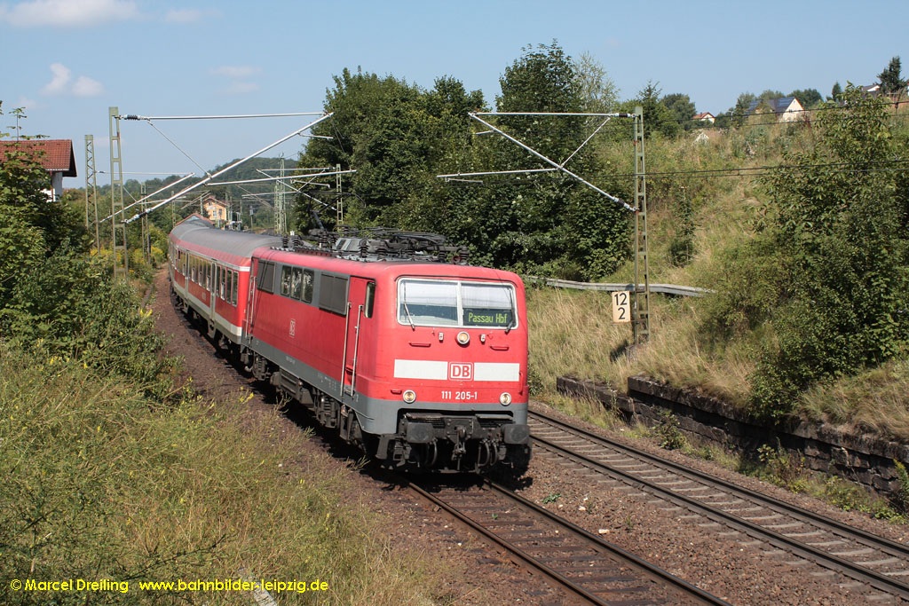 am 12.08.09 mit RE 4249 Nürnberg Hbf - München Hbf in Obertraubling, es schiebt 111 187-1